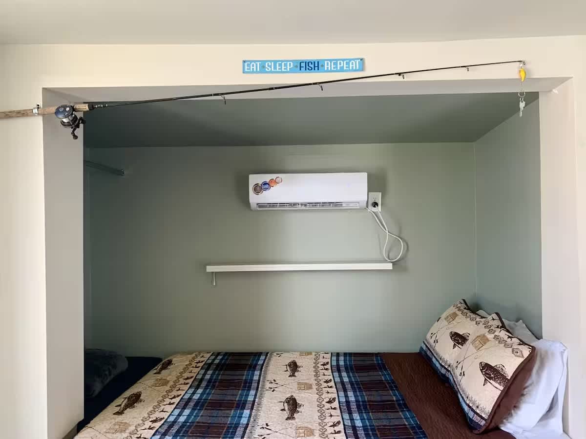 The InnHabit tiny house resort contains 10 separate tiny houses arranged into 5 sets of tiny houses, each with a separate downstairs and upstairs unit. The 5 sets are arranged in a semicircle around a central grain bin gazebo gathering place. A River Runs Through It is one of the first floor tiny houses, and it is located directly behind the gazebo in the center. It has a queen bed with a full sized trundle that pulls out from under the queen, as well as a kitchenette with microwave and mini fridge, and a bathroom with shower stall.