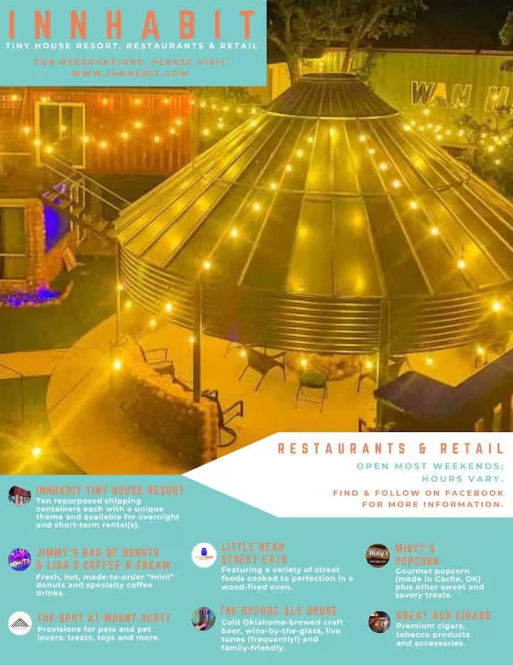 InnHabit is a tiny house resort nestled in the small southwest Oklahoma town of Medicine Park. Our resort has 10 tiny houses arranged in sets of 2 tiny houses each, and coming soon are 2 restaurants, a craft beer tap room, and 4 tiny shops. Other shops and restaurants are across the street and a very short walk down the street. We are in the heart of town, so expect lots of foot traffic and occasional noise, especially during events. In the Heart of Medicine Park, Right outside of Fort Sill perfect for Basic Training Graduation.
