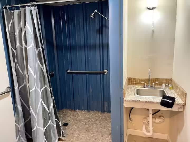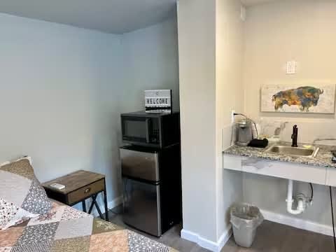 The InnHabit tiny house resort contains 10 separate tiny houses arranged into 5 sets of tiny houses, each with a separate downstairs and upstairs unit. The 5 sets are arranged in a semicircle around a central grain bin gazebo gathering place. Prairie Life is one of the first floor tiny houses, it's blue and it is located in the southwest corner near the ballerina carving (to the back right if you enter from the InnHabit arch). It has a queen bed and a chair that makes into a twin bed, as well as a kitchenette with microwave and mini fridge, and a bathroom with a large walk-in shower. Step out the door to the steps to our ever popular Refuge Ale House, Misty's Popcorn shop, and the Little Bear Cafe. Buy gourmet cheeses and olive oil across the street or stock your mini fridge with adult libations at Up the Creek Spirits.