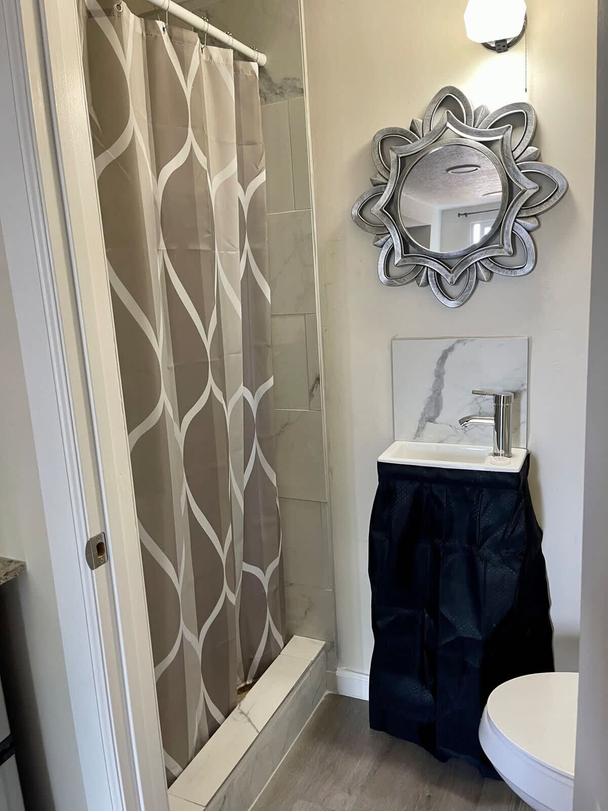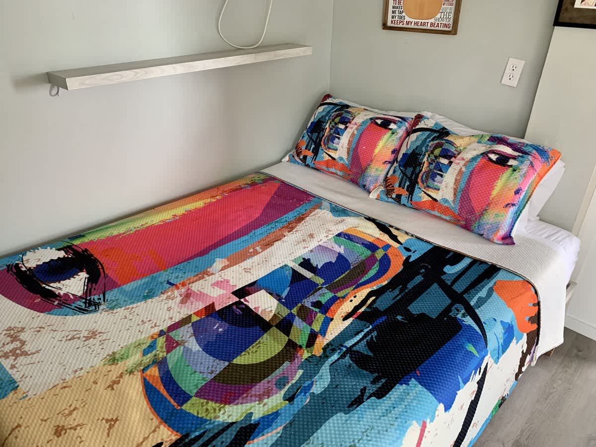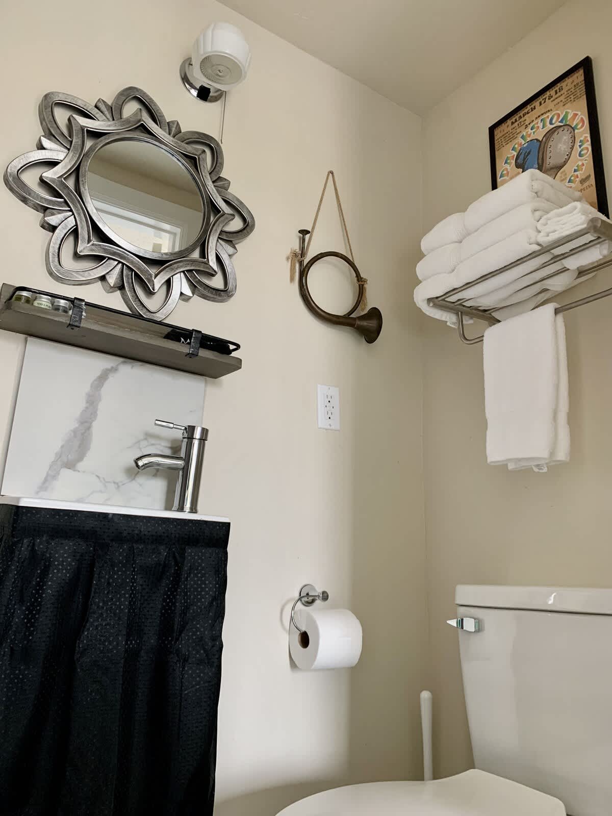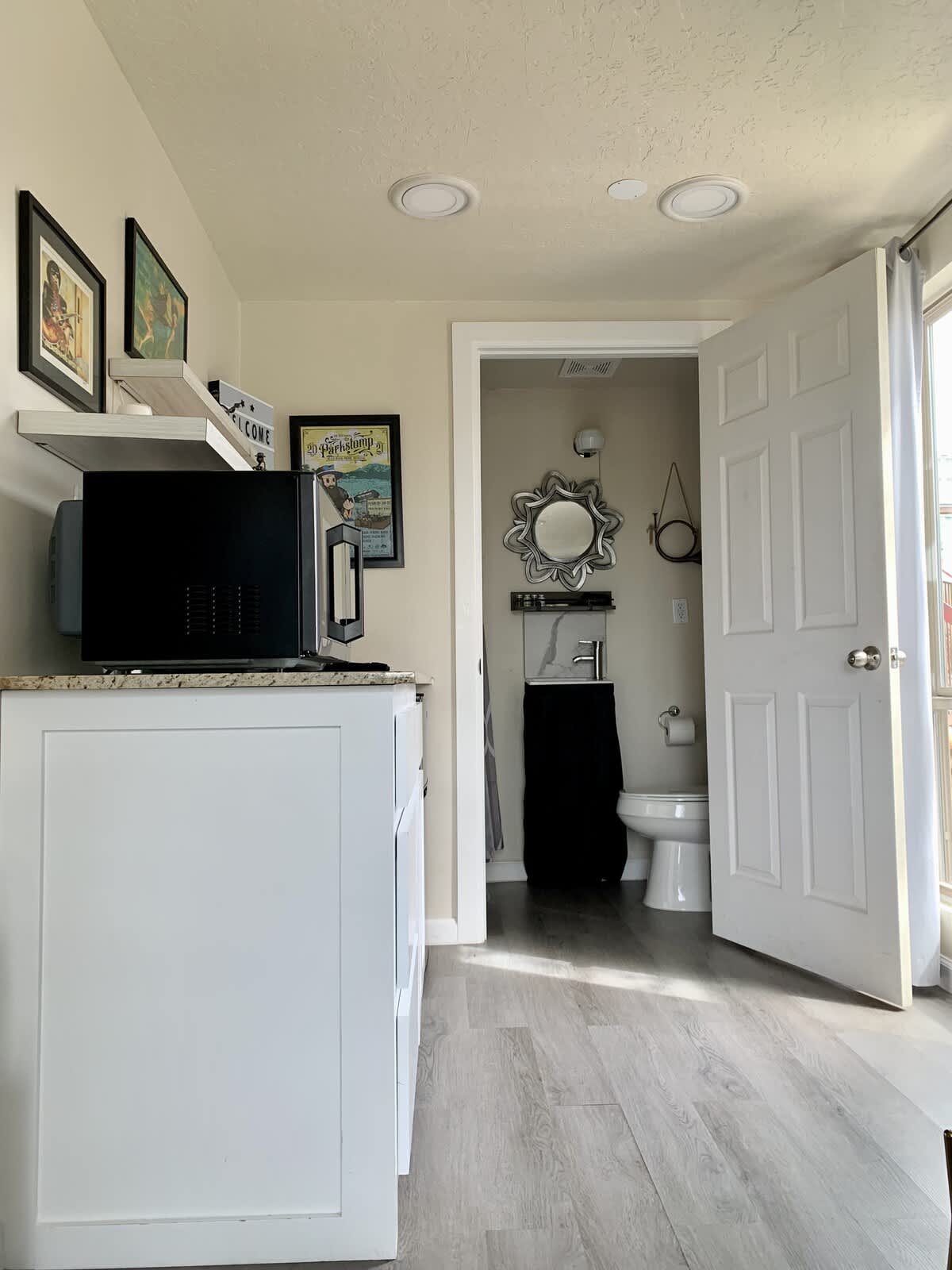 Imagine two of our fun tiny house units, stacked together as a two-story tiny house. It’s the ultimate grown-up fort – sleeping up to 8 of your favorite people. Each unit comes with a SmartTV, WiFi, mini-fridge, microwave, Keurig, bar sink, and the cutest little bathroom you’ve ever seen