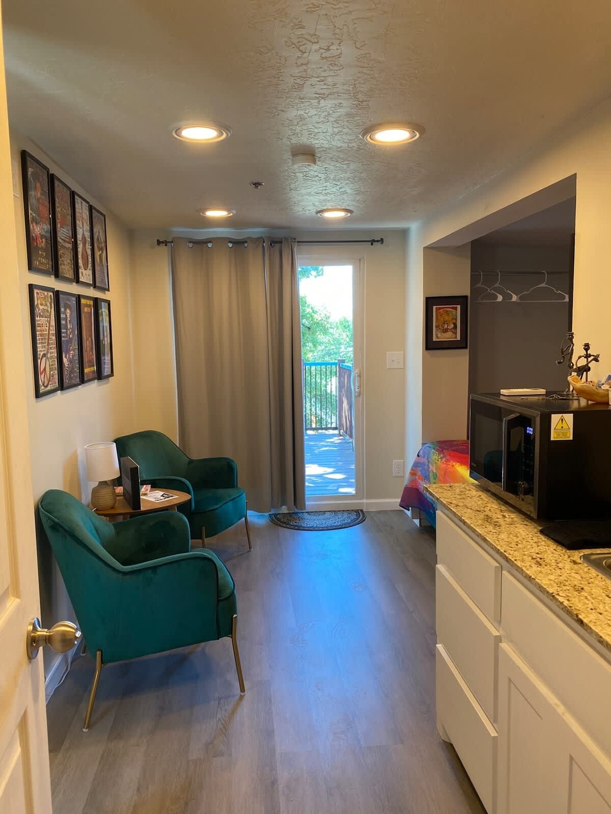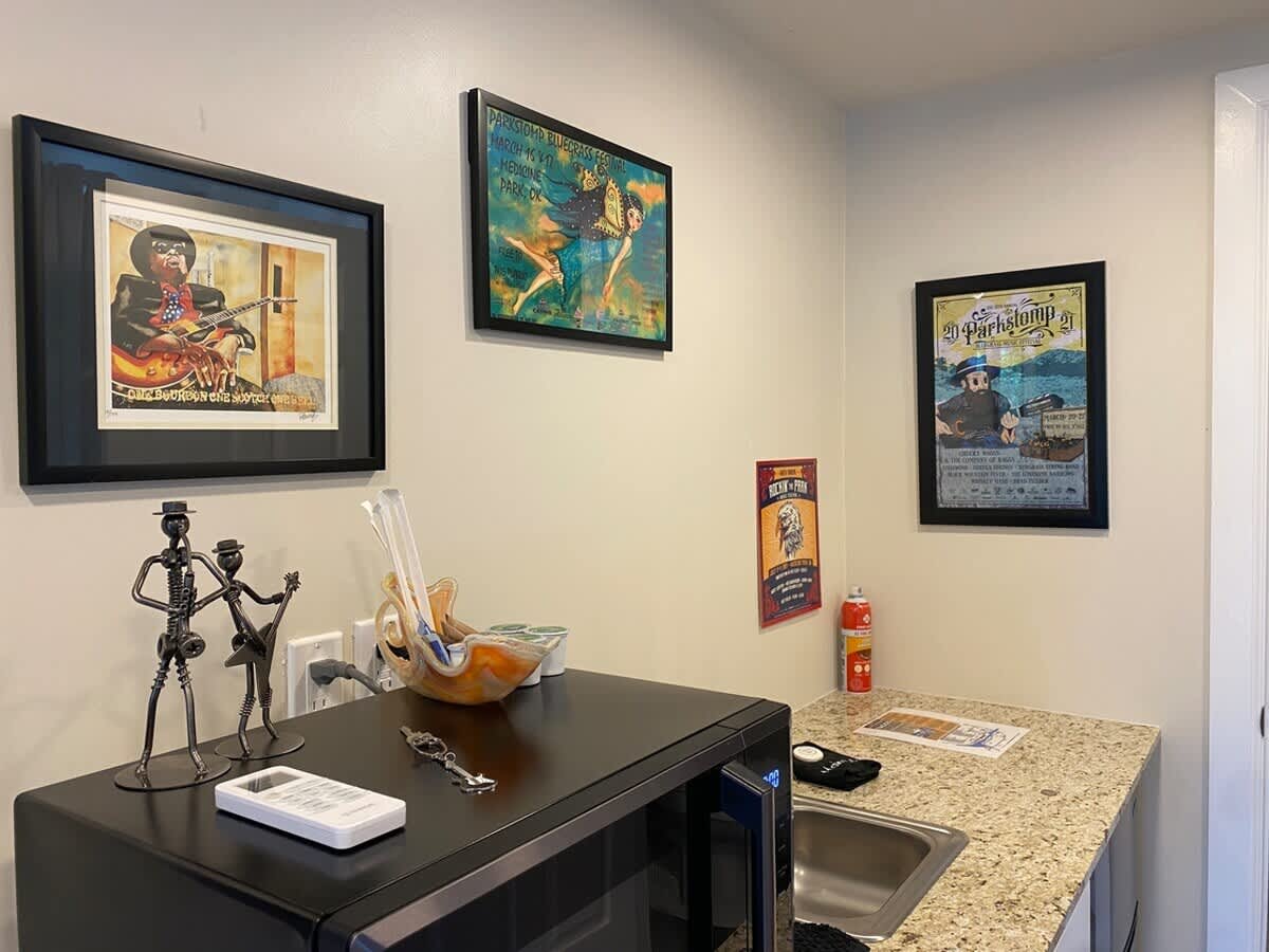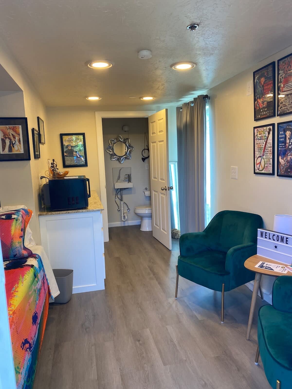 The InnHabit tiny house resort contains 10 separate tiny houses arranged into 5 sets of tiny houses, each with a separate downstairs and upstairs unit. The 5 sets are arranged in a semicircle around a central grain bin gazebo gathering place. Let the Music Play is one of the second floor tiny houses, and it is located to the southwest behind the gazebo (to the back right if you enter from the front InnHabit arch), above Prairie Life, next to the ballerina tree carving. It has a queen bed with a full sized trundle that pulls out from under the queen, as well as a kitchenette with microwave and mini fridge, and a bathroom with shower stall.